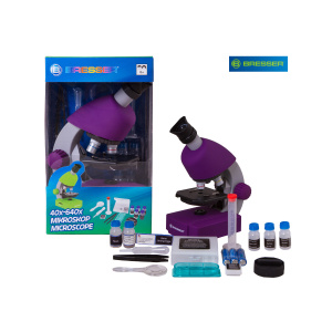 Микроскоп Bresser Junior 40x-640x, фиолетовый прост в использовании. Он поставляется в собранном виде, не имеет съемных частей и будет понятен даже очень юному пользователю.