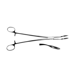 Корнцанг изогнутый 256 мм. Хирургический инструмент для захватывания и подачи стерильных инструментов и перевязочного материала, представляющий собой зажим с кремальерой, длинными прямыми или изогнутыми браншами и овальными губками с насечкой.